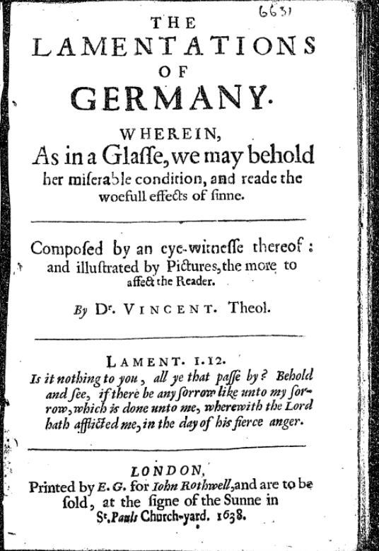 In the spring of 1638, the Stationer William Howes died, leaving few tangible marks of his young life. He had been a member of the Company of Stationers, the London guild which theoretically controlled most of the printing and bookselling in England. However, he is one of many who barely surface in the records of the Company. Nor does he appear to have been involved in the publication of any surviving texts. Despite this absence, William left a last will and testament in which he bequeathed to his brother Thomas (fl. 1617-1638) three books; ‘Armeniasme Dixon on ye Hebrews Aynswer’, ‘the Comunion of Saintes’ and the ‘Lamentacons of Germany’.[1] William’s membership of the print trade meant he would have acquired them directly through his work or indirectly through his knowledge and contacts within the trade network. However, they were seemingly personal texts, intended for someone William believed would appreciate them as he had done.