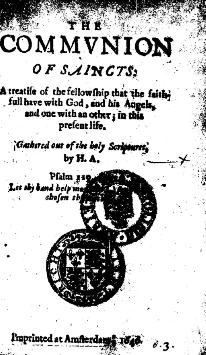 The second text bequeathed was ‘The Comunion of Saintes‘. This is more difficult to identify. It may have been Edward Maie’s, A sermon of the communion of saintes or Henry Ainsworth’s The communion of saincts. Maie’s work is a short tract, Ainsworth’s runs to hundreds of pages and both are weighty theological discussions. The only extant text of Maie’s work is from 1621 and so it does not fit the pattern set by William’s other books which were current at the time of his death. Ainsworth was a minister in a separatist church in Amsterdam and a prolific author. If this was his text then we should note that the earliest London edition was not published until 1641, after Howes’ death. Either this bequest shows a London edition prior to those previously known or it came from abroad. Before 1641 this text had borne an Amsterdam imprint including a 1640 edition probably from the ‘Richt Right Press’, an English Calvinist publishing operation which produced a number of bestsellers in the late 1630s and early 1640s (see Figure 2).[3]