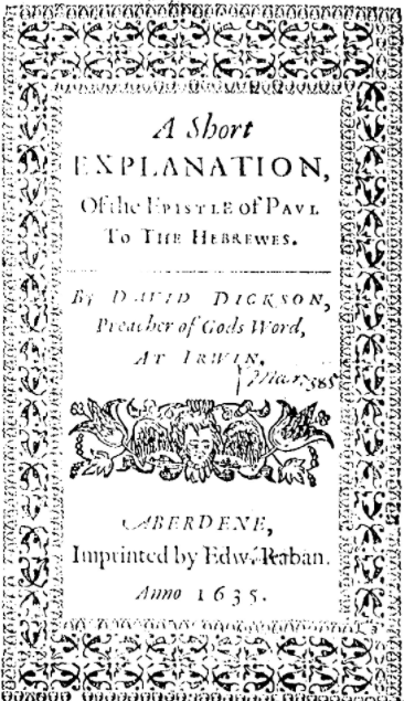 The first book William bequeathed was ‘Armeniasme Dixon on ye Hebrews Aynswer’. This was certainly David Dickson’s A short explanation, of the epistle of Paul to the Hebrewes (1635–37), a significant and bulky theological book of around 500 pages by a leading Scottish Calvinist minister (see Figure 1). The text does not appear in the Stationers’ Registers of London, and one version was published in Aberdeen and another in Dublin ‘by the Society of Stationers’.