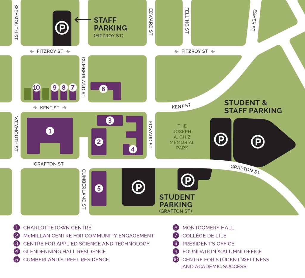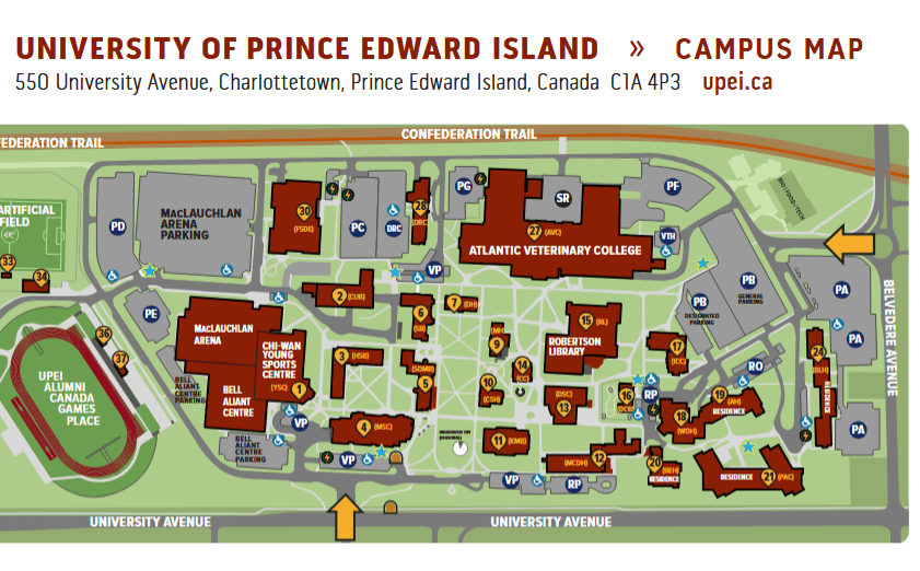 - Driving: take the Belvedere entrance to UPEI, park in PA or PB.