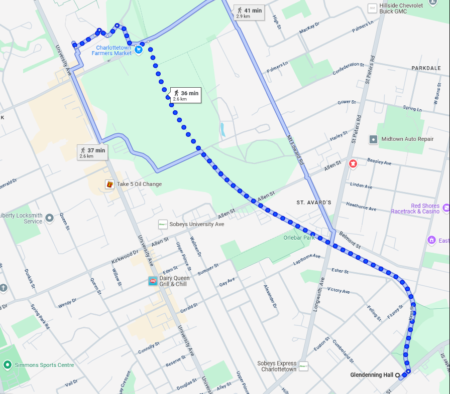 - Walking: 36 minutes, up University Ave or along the Confederation trail (map below)